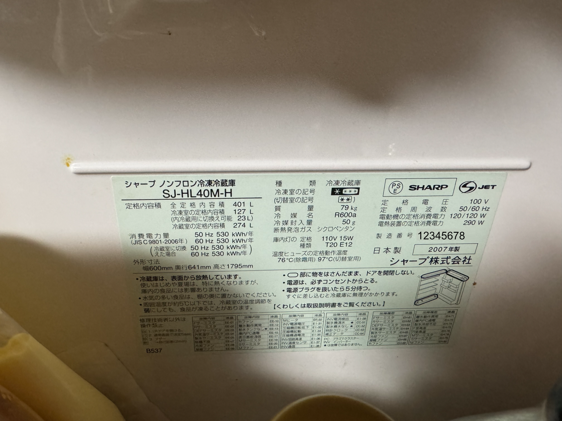 使用中の冷蔵庫の品番やメーカー名がわかる写真、傷などの汚れのアップ